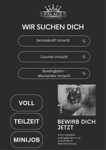 Dann bewirb dich jetzt und werde Teil unseres Teams! Wir freuen uns auf dich!Bewerbungen an bowling@palace-rv.de